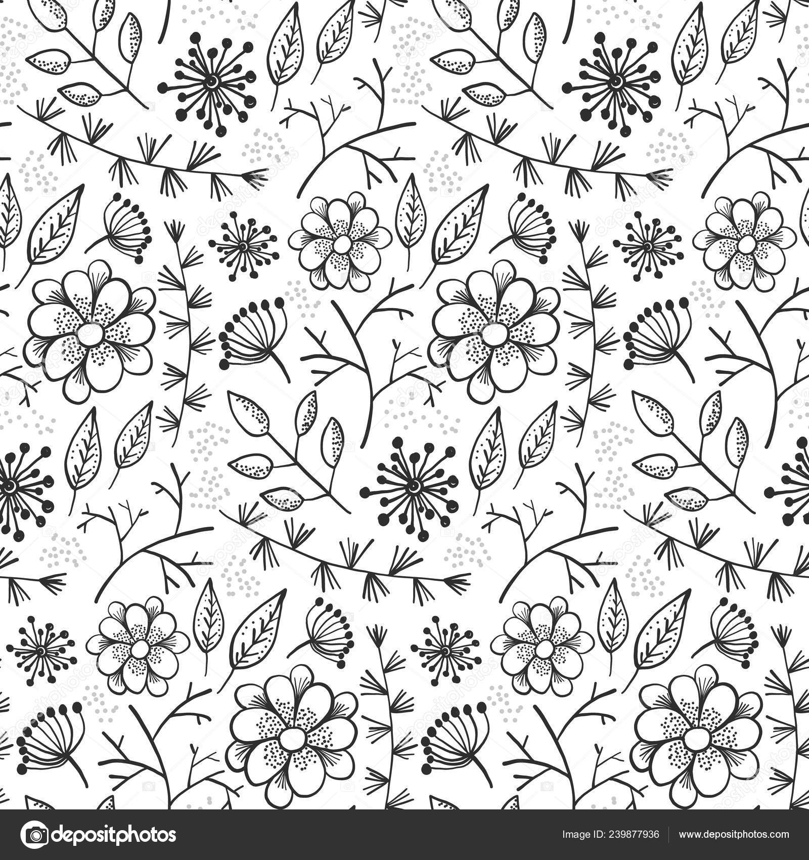 Monochrome Doodle Floral Seamless Pattern With Outline Black Flowers And Leaves On White Background Lovely Floral Texture With Blossoms And Herbs For Textile Wrapping Paper Surface Wallpaper Buy This Stock Vector
